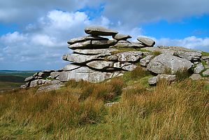 (Wikipedia) Beeindruckende Tore (durch Verwitterung entstandene Gesteinsformationen) erheben sich über dem hügeligen Land, das während der Bronzezeit dicht besiedelt war. Viele prähistorische Hügelgräber und Steinkreise (The Hurlers) finden sich über die Landschaft verteilt. Heute ist die Region mit Ausnahme des kleinen Dorfes Bolventor fast menschenleer. An den südlichen Hängen des Moors liegt der Dozmary Pool, in den, nach der Überlieferung der Artussage, Sir Bedivere das Schwert Excalibur warf, um es der Lady of the Lake zurückzugeben. Neben dem Dozmary Pool bildet der Stausee Colliford Lake ein weiteres Feuchtgebiet im Bodmin Moor.